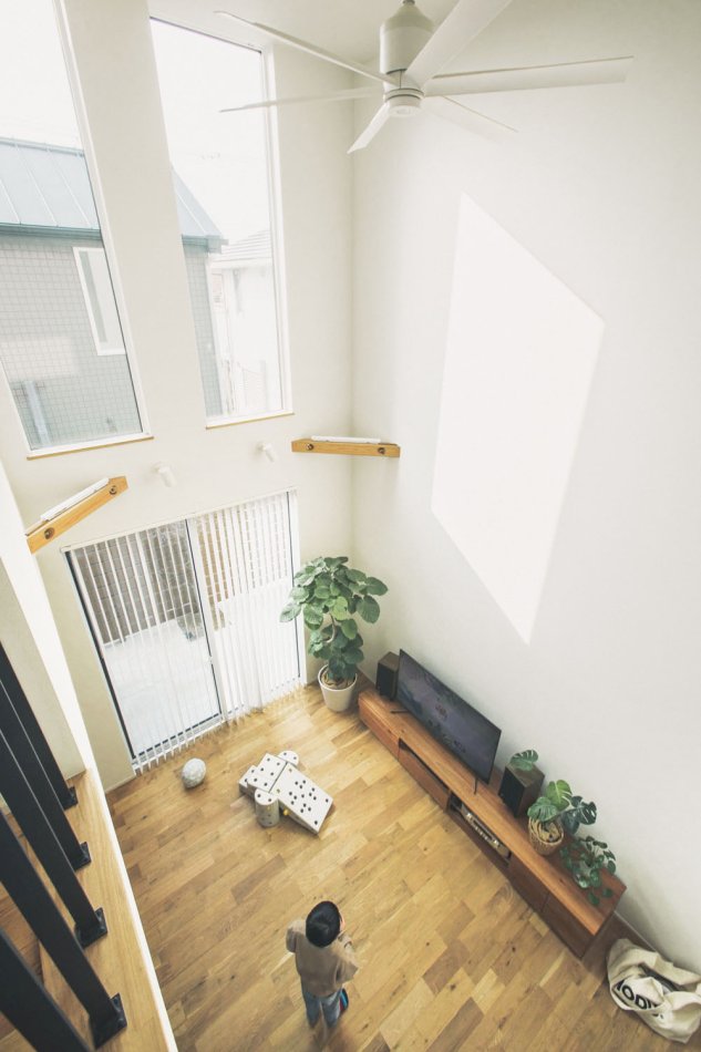 また、吹き抜けの天井にシーリングファンを